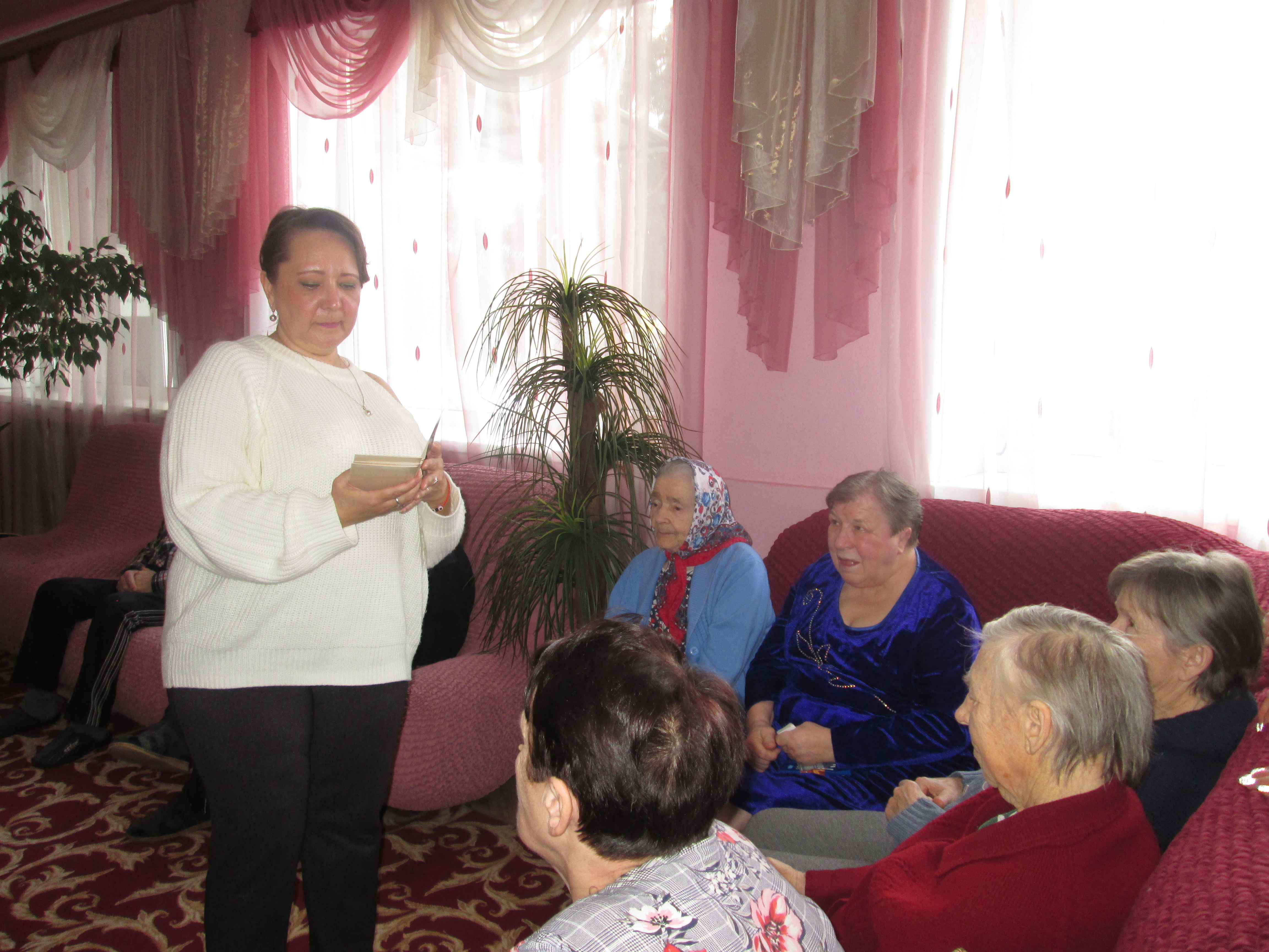 Теплые слова в адрес всех женщин, присутствующих на празднике, произнесла заведующая отделением Шамрина Людмила Николаевна. Проживающая Холманских Людмила Петровна подготовила для всех женщин красивое стихотворение и прочла его.